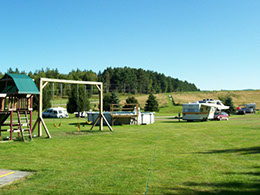 RV's are welcome to set up along sites adjacent to wooded areas. The campsites designated for RV's sit on lawns near