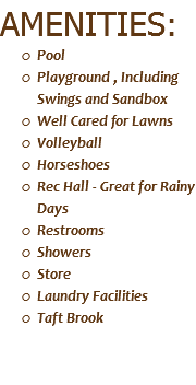 Campsites also enjoy adjacent woods and Taft Brook, area wildlife, campfires, along with our amenities to help make your stay comfortable and enjoyable.